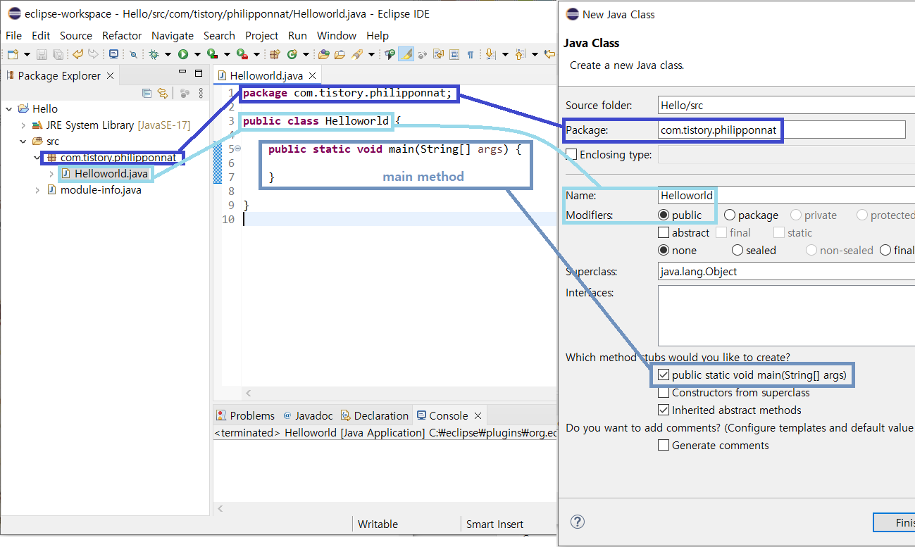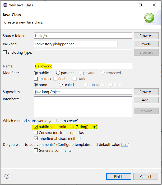 Name 칸에 'Helloworld' 입력 후, public static void main(String[] args)에 체크.