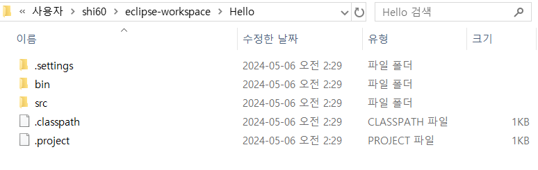 생성한 파일들이 저장되는 elipse-workspace 폴더의 프로젝트 파일 Hello에 들어가보면,