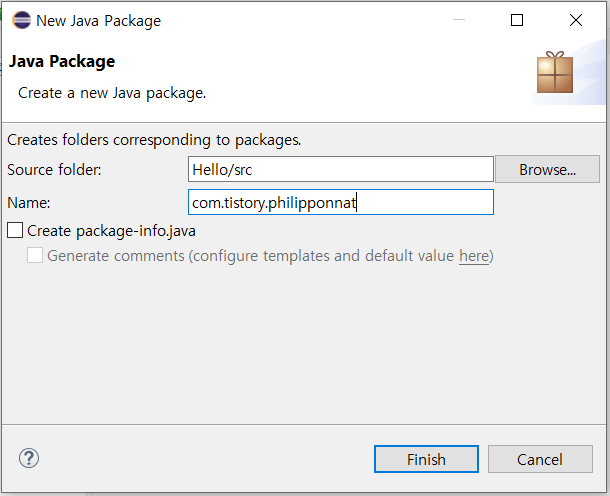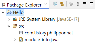 Hello > src > com > tistory > philipponnat 순으로 폴더가 만들어짐.