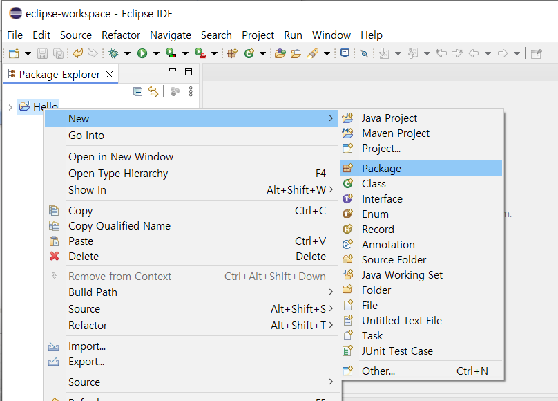 Hello 프로젝트에서 오른쪽 마우스 클릭 - New - Package.