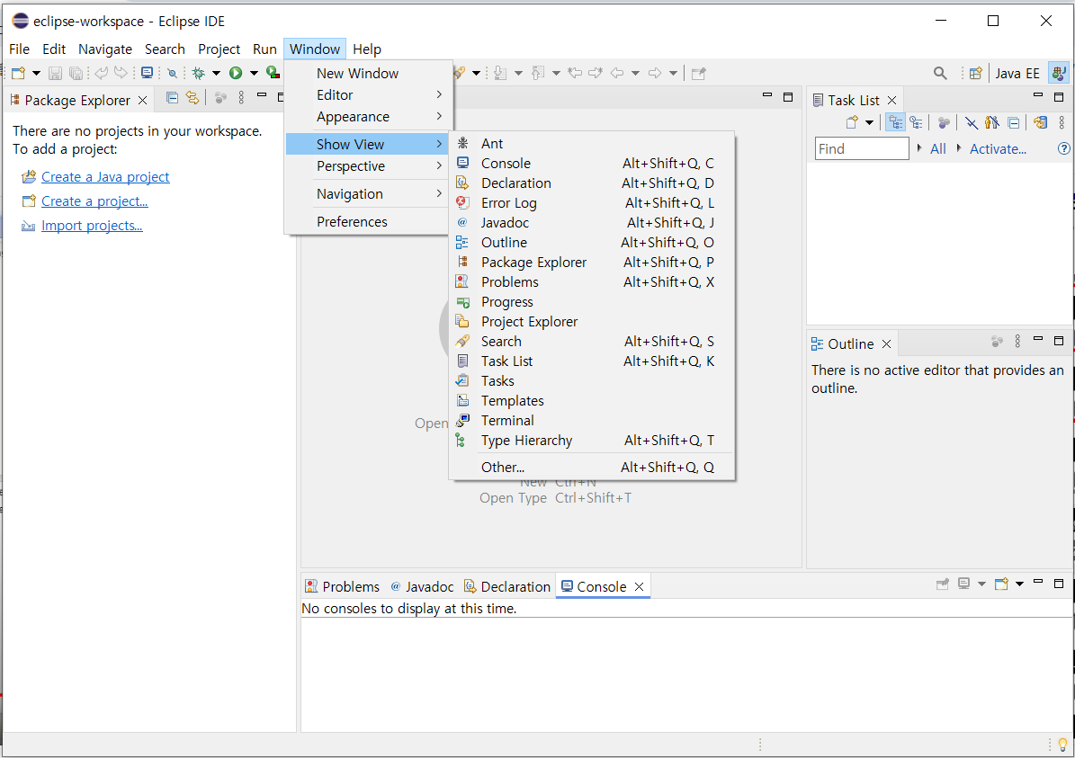 Window - Perspective 에서 Persepective를 저장하거나 Reset 하거나 Customizing 가능.