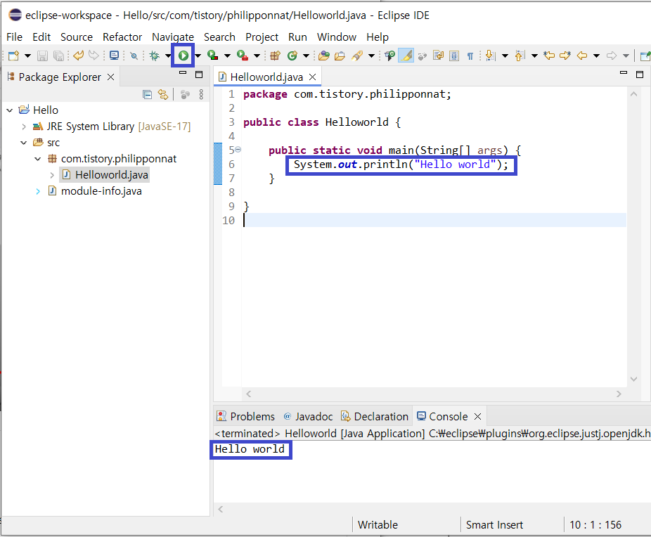 System.out.println("Hello world"); 를 입력하고 Run버튼을 누르면,