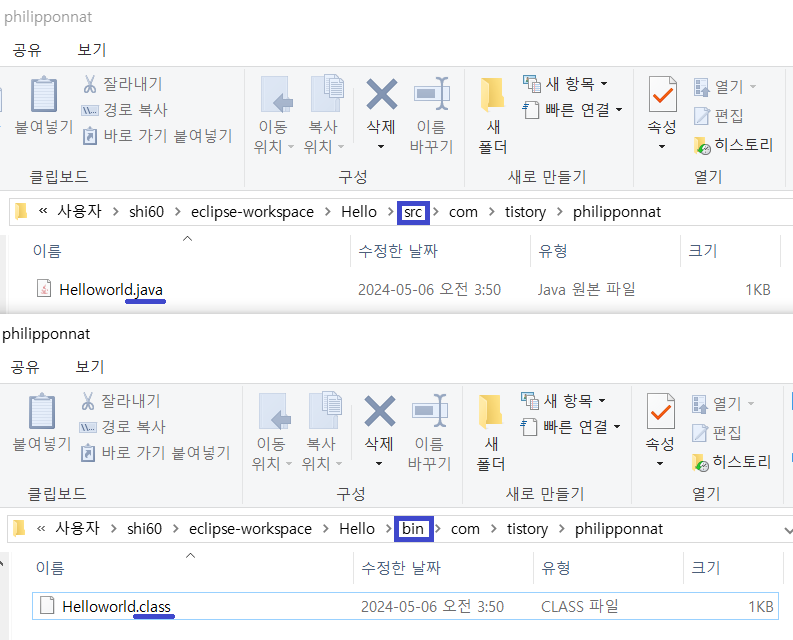 컴파일된 클래스가 저장되는 bin폴더에도 패키지 순서로 폴더가 생성되어 있고,