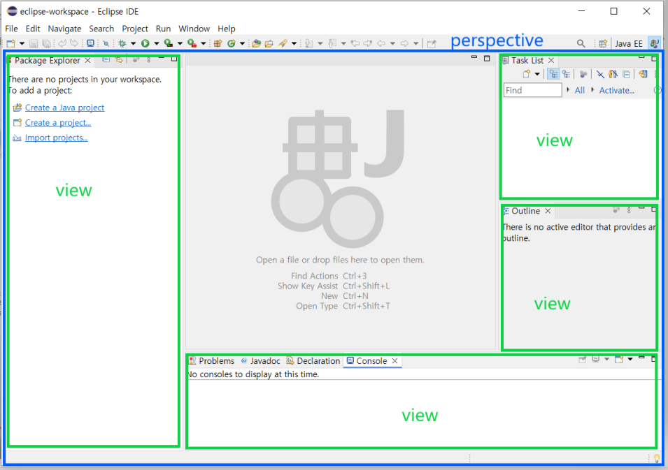 view (연두색) : 이클립스를 이루고 있는 작은 창. 드래그하여 원하는 위치나 크기로 바꿀수 있음.