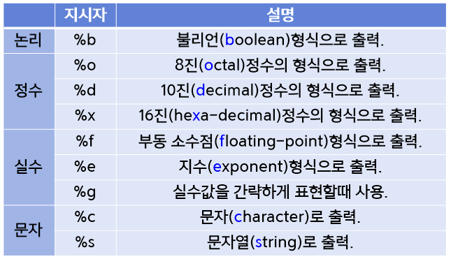 출력 할 값을 다른 형식으로 출력하고 싶을때 , printf()와 지시자를 사용하여 출력함.