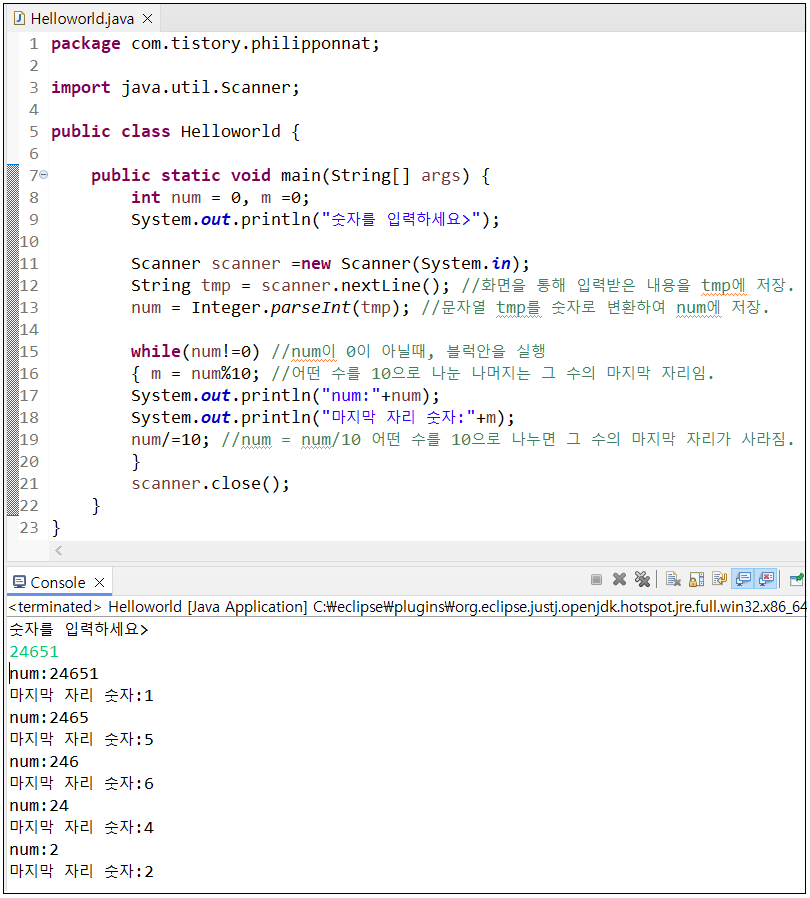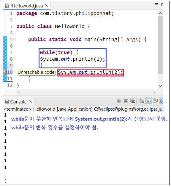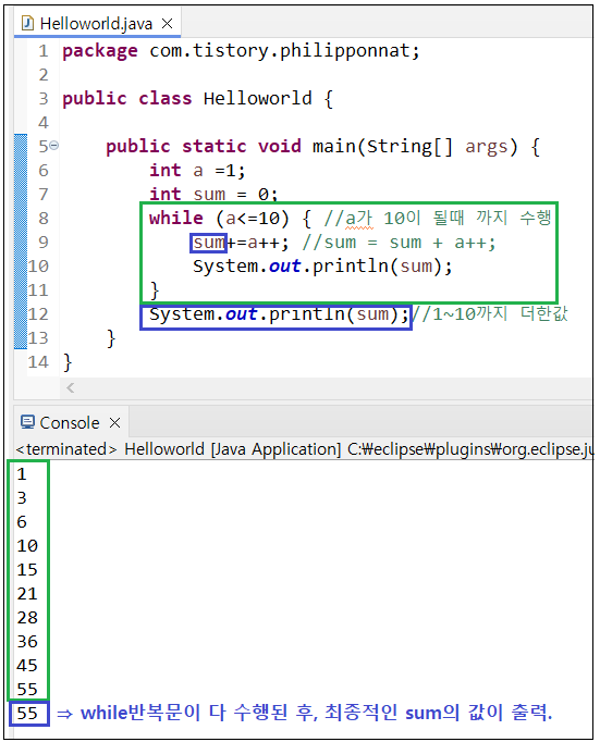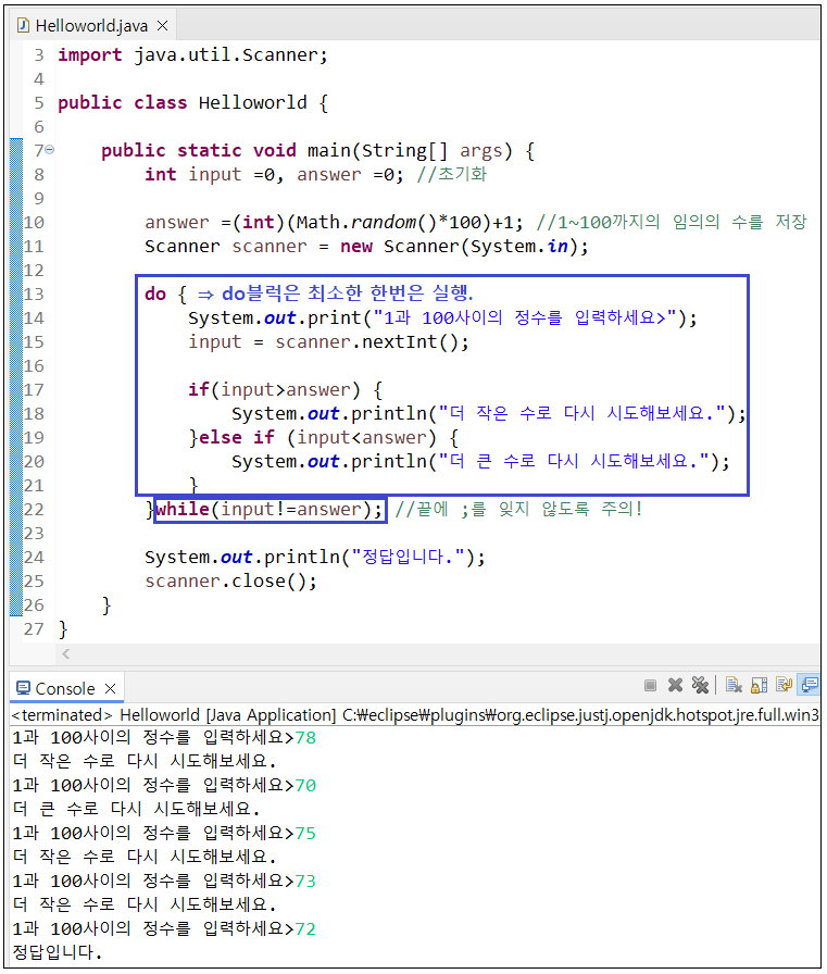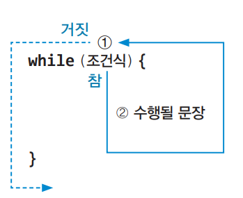조건식이 참(true)인 동안, 즉 조건식이 거짓이 될 때 까지 블럭{}내의 문장을 반복.