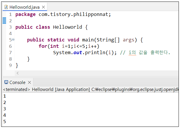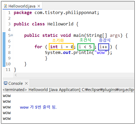● 증감식 : i++, i--, (x+=2, y--) 등의 형태로 시작점에서 도착점까지 얼마만큼 증감할 것인지를 지정함.