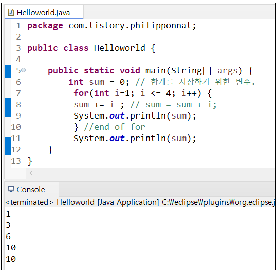● 조건식 : i <= 10 이나 x<y 같은 형태로 도착점 및 반복 횟수를 지정함.