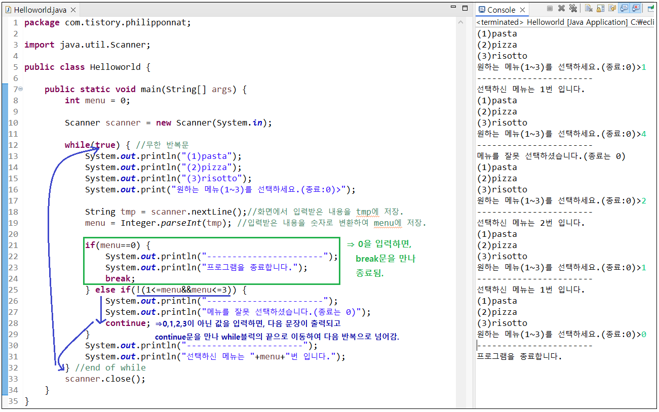 (continue문과 반복문 블럭의 끝 사이의 문장을 건너뛰고 반복을 이어감.)