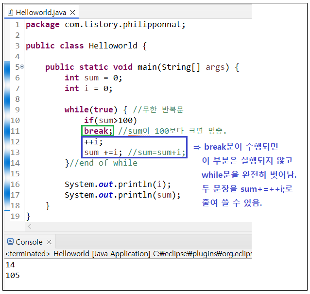 무한반복문에서 조건문과 break가 없으면 무한히 반복되기 때문에