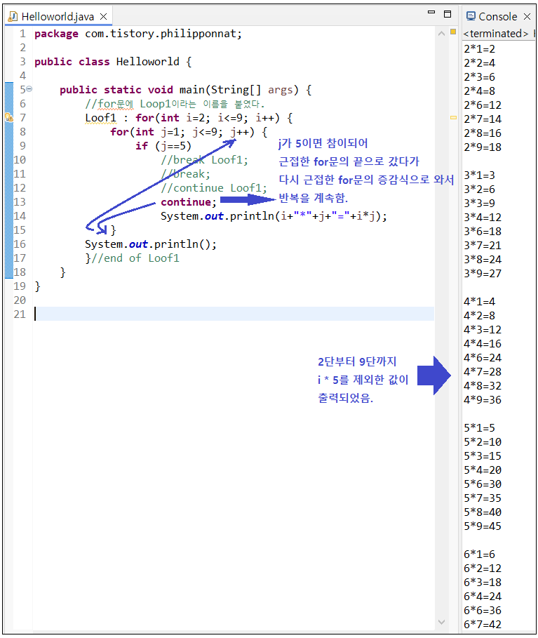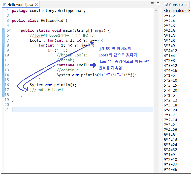 하지만, 반복문 앞에 이름을 붙이고 break문과 continue문에 이름을 지정해주면