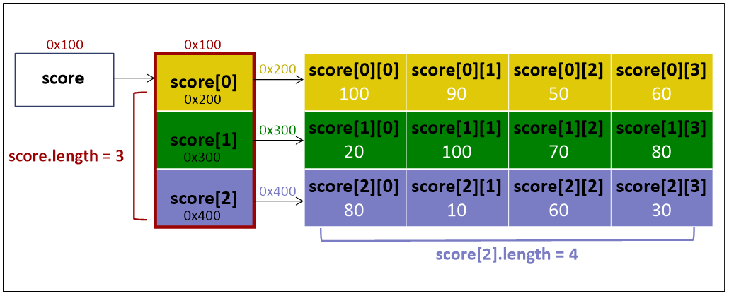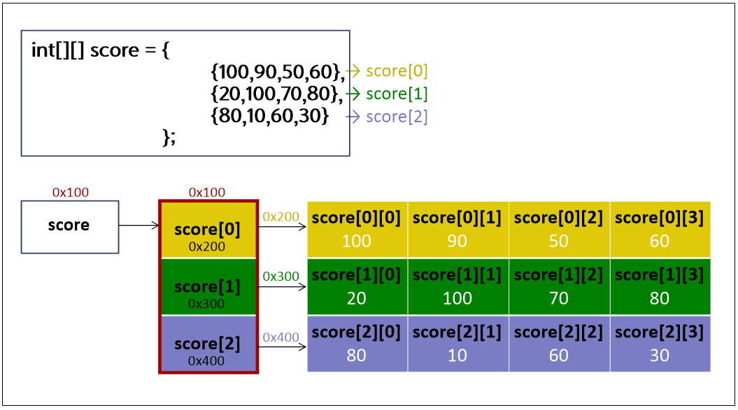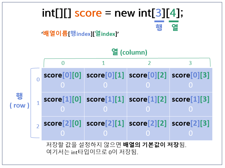 int[][] score = new int[3][4]; 와 같이 배열 score를 생성하면, (※아래 그림 참고)
