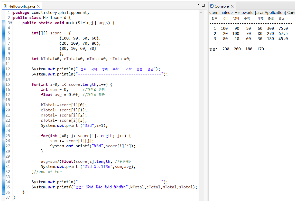 ※ 위의 식을 이용하여 총점과 평균을 구하는 예제