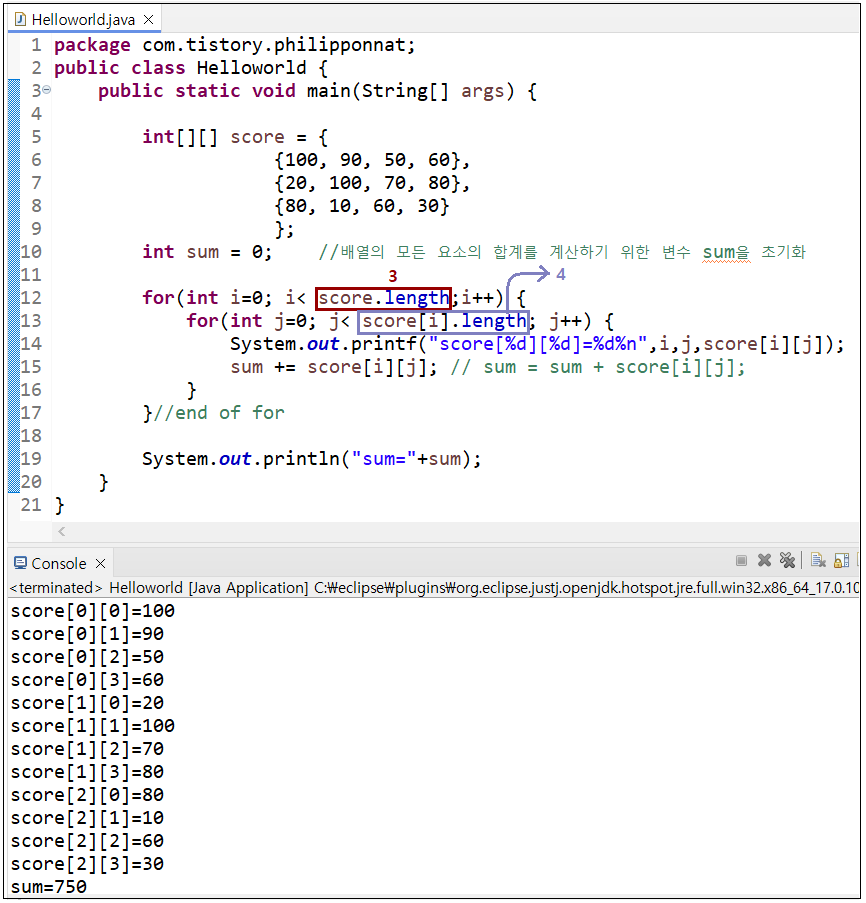 ※ 위의 식을 이용하여 2차원 배열 score의 모든 요소의 합을 구하고 출력하는 예제