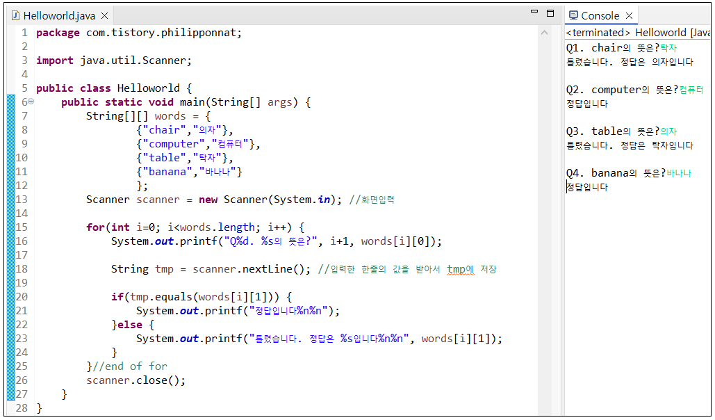 ※ 2차원 배열을 이용한 영단어를 보여주고 단어의 뜻을 맞추는 예제