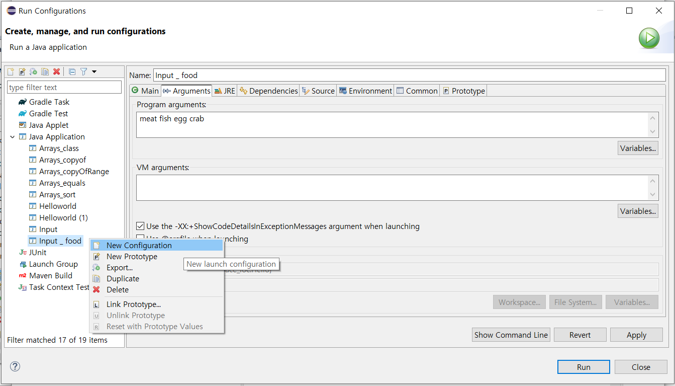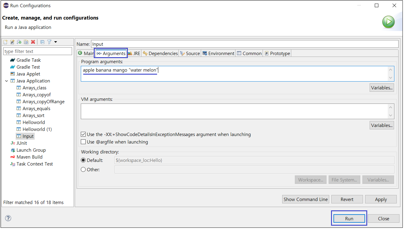 ② 이 화면에서 Arguments 탭을 클릭하고, 'Program arguments'에 원하는 값을 입력.