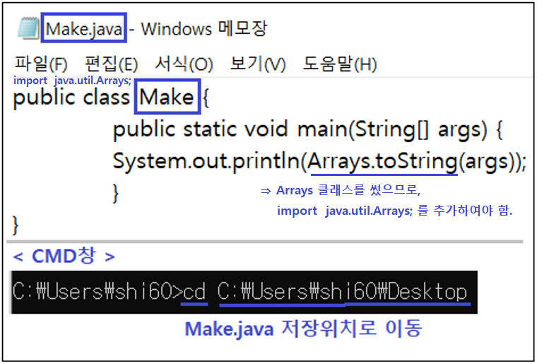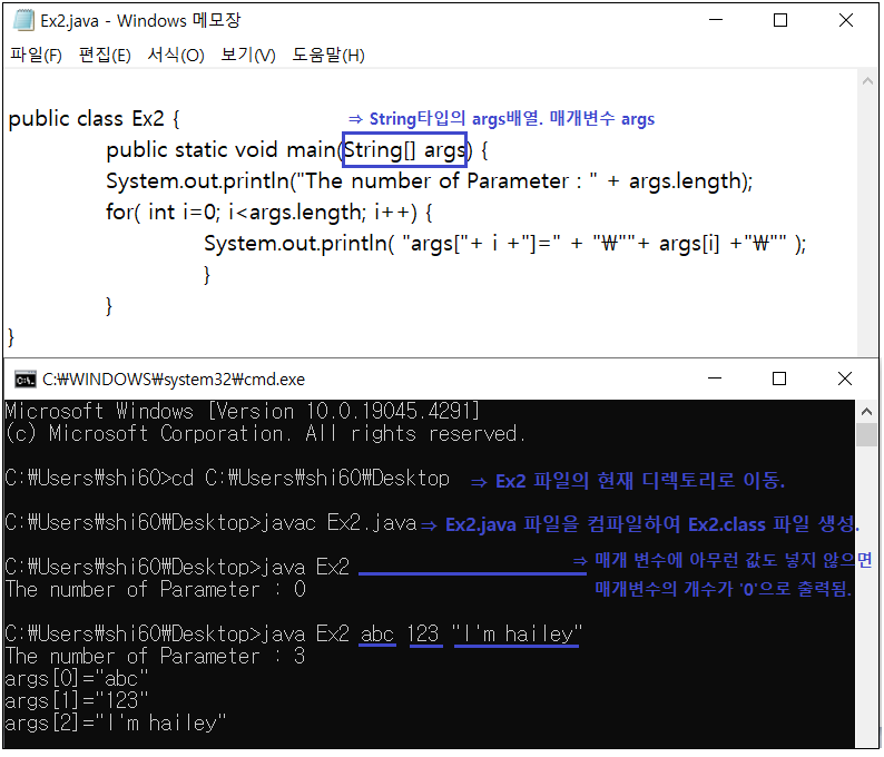 예제1 _ 메모장과 CMD를 이용하여 컴파일 후, 매개변수 입력결과 출력하기.