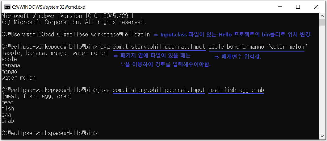 ③ CMD창 - java 파일명 매개변수1 매개변수2 매개변수3 를 입력하기