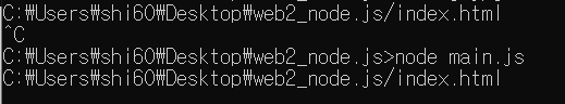 명령 프롬포트 창에 'C:\Users\shi60\Desktop\web2_node.js/index.html'가 생김.