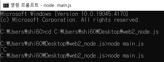 명령 프롬포트 창에 'node main.js'를 입력 하면 node.js가 'main.js' 파일 다시 실행.