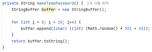 ▪ StringBuffer 를 사용하여 임시 비밀번호를 문자(char)로 하나씩 추가하여 랜덤한 문자의 10자리 임시 비밀번호 생성.