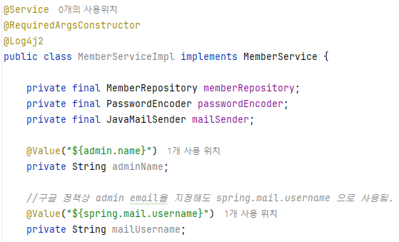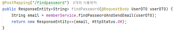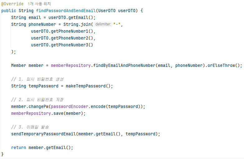 2️⃣ Service (findPasswordAndSendEmail 메서드) 와 Repository (MemberRepository)