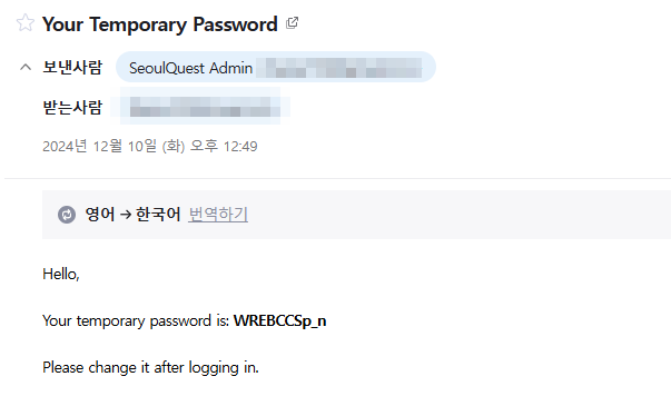 ▪ 전송된 임시 비밀번호는 데이터베이스에 저장되어, 이후 로그인 시 사용됨.