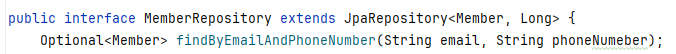 - JpaRepository 상속시, Member엔티티의 변수 이름으로 쿼리 메서드 생성가능. → findByEmailAndPhoneNumber 메서드를 통해 조회된 Member 엔티티 반환.