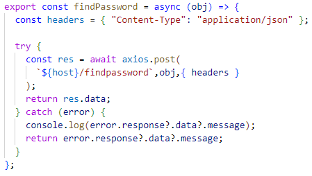 - axios.post를 사용하여 POST 방식으로 백엔드 /findpassword 엔드포인트에 요청을 보냄.