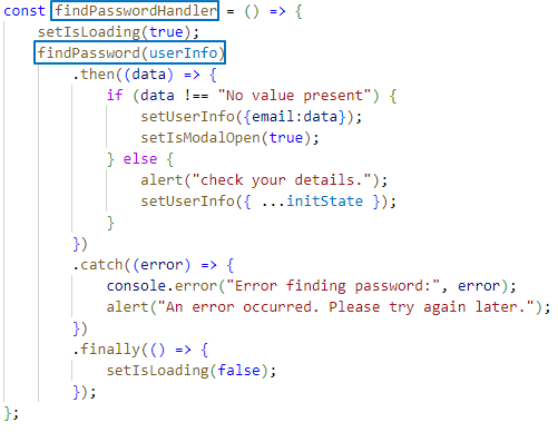 - 사용자가 Next 버튼을 클릭하면 findPasswordHandler 함수가 실행 됨.