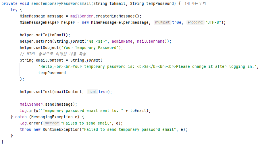 ④ 이메일 발송 (sendTemporaryPasswordEmail).