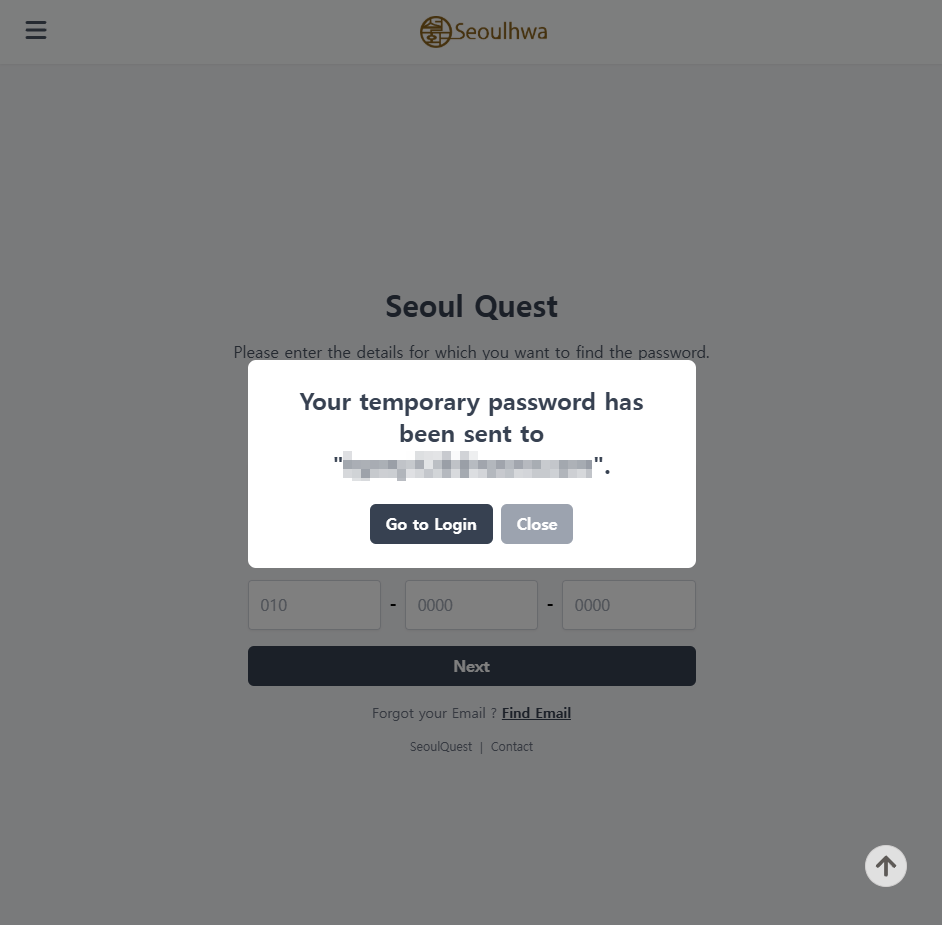 "임시 비밀번호가 이메일로 전송되었습니다"는 모달 창을 띄워 사용자에게 알림.