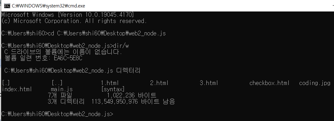 *dir/w : 시간, 날짜를 제외한 경로의 폴더와 파일들의 목록이 표출되는 명령어.