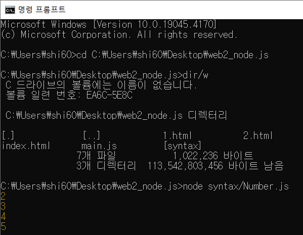 CMD 화면에서 node syntax/Number.js 를 입력하면 '2' 가 출력 됨.