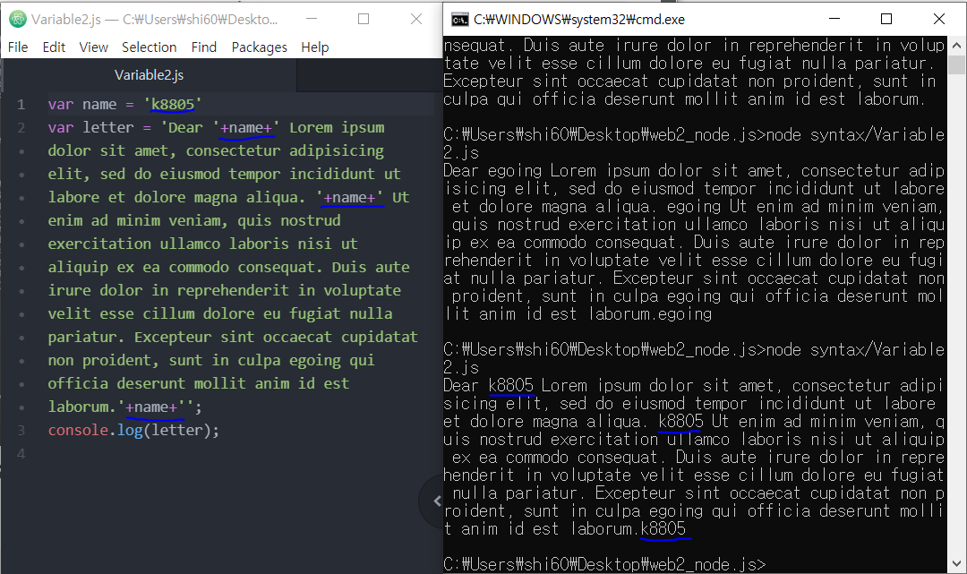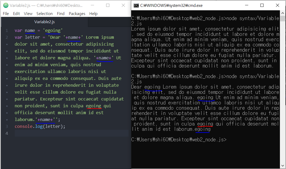 CMD 에서 node syntax/Variable2.js 를 입력하면 ( ) 안의 긴 문장이 출력됨.