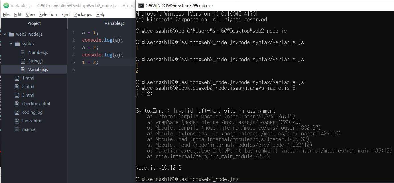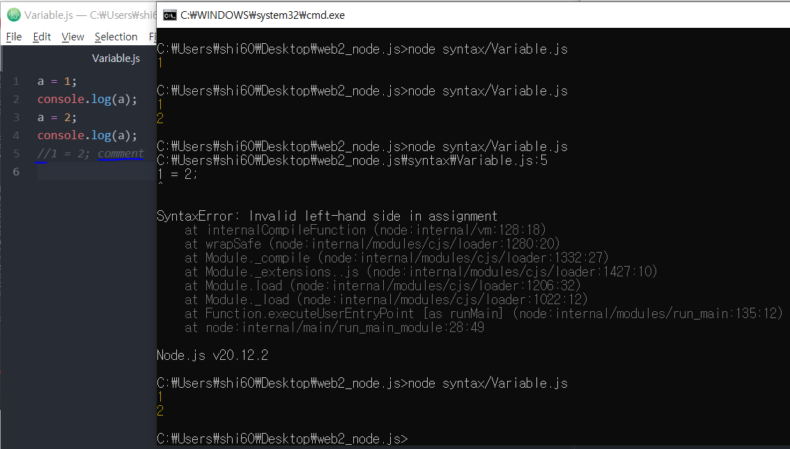 1 = 2; 라는 잘 못된 값을 입력시 CMD 창에 오류 메세지가 뜸.
