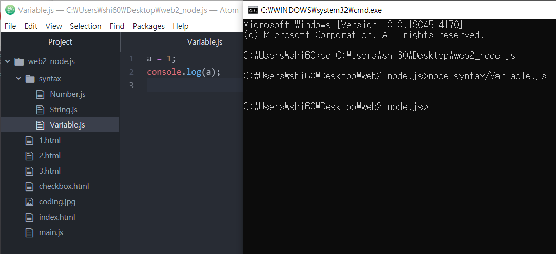 CMD 에서 node syntax/Variable.js 를 입력하면 '1' 이라는 값이 출력됨.
