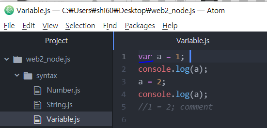 Atom 에디터에서 Variable2.js 파일에